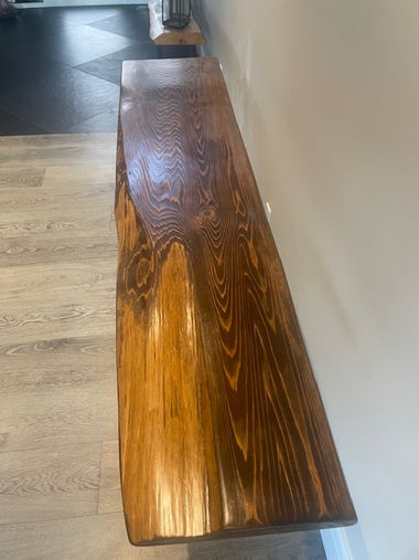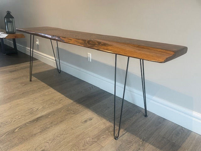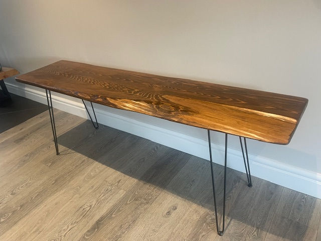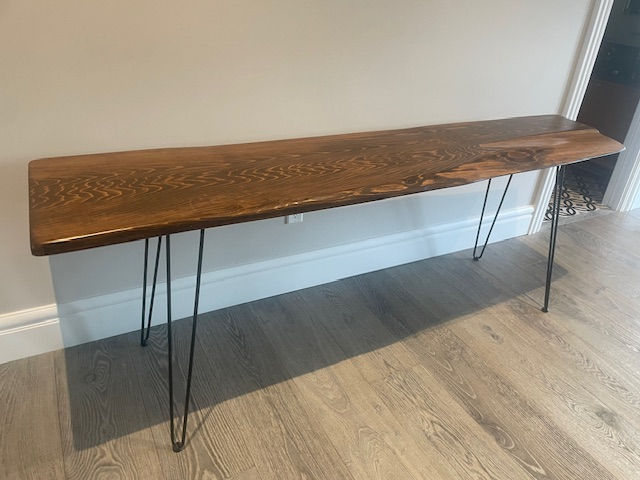Solid wood live edge table, perfect addition for any home or office. Add warmth to any space, this table is solid Cedar and measures 84 inches long and 19 inches wide and stands 29 inches high.
